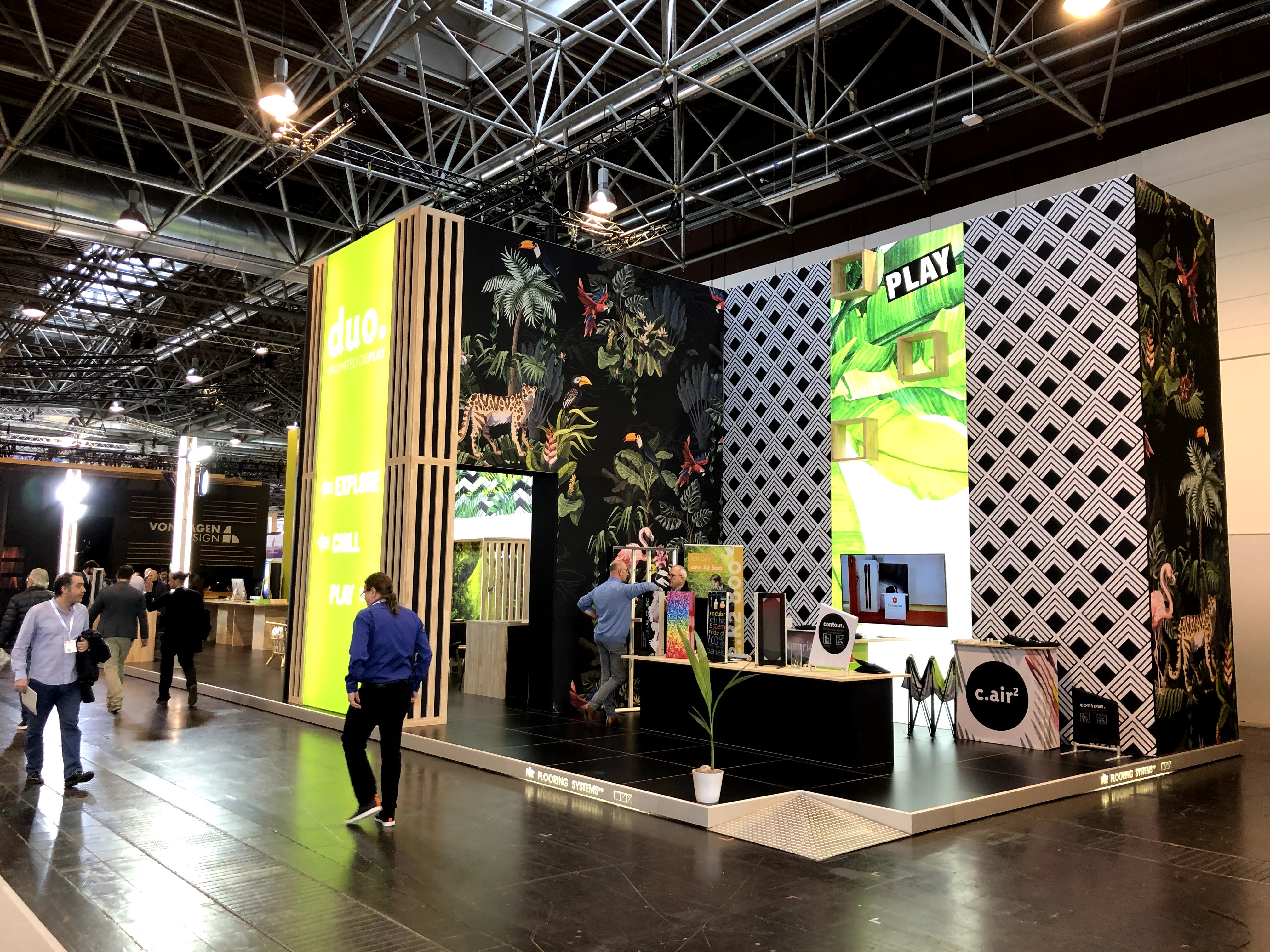 Booth design is no longer one dimensional. To create a space that truly stands out and grabs the eye of the show attendee, booths are now incorporating three-dimensional elements to draw in show attendees. US Director of Sales, Rebecca Thompson, says “We saw several booths at this show that had elements which incorporated 3D tactility onto walls, floors, and even ceilings. Hell, we’re one the companies that did this with a CNC wooden moose on our stand.” However, harnessing tactility within a space has become an integral part of the creation of a booth environment. Why? Well because raised textures and different surface materials all help to create an environment that entices the sensors of show attendees - inviting them into a relaxed and comforting space that is ideal for business transactions.