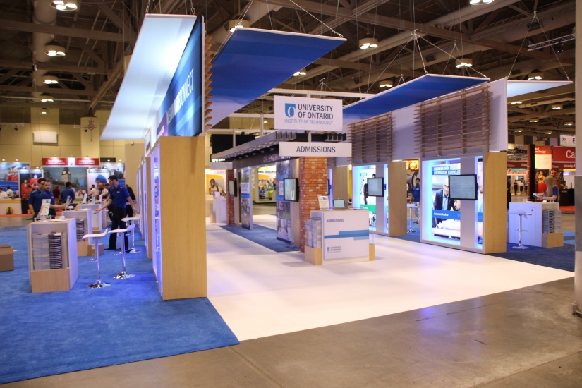 stevensE3 is proud to unveil a Masterpiece in exhibitry at the 2014 OUF Conference held in Toronto, Canada. Earlier this year stevensE3 was awarded the contract to design and construct the 3,000 sq. ft. UOIT pavilion at the annual event, a 6th University customer for stevensE3 at this show. stevensE3 kept the design under wraps until the unveiling at this years OUF. The objective was to design a booth that gave students an impression of what it was like on campus, and to feel like they were a part of the environment. Joe Stokes, Associate Registrar, Enrolment Services at UOIT said "for UOIT success at the OUF is a space that is warm and inviting, a space that students can see visually our message of a small university that is focused on innovative programs, technology and student content." When asked how well stevensE3 did in working with UOIT staff, Joe states that stevensE3 "gave us a design that helped us recreate a modern version of our campus within a trade show format, right on the trade show floor. They were able to develop meaningful relationships with our people, making them feel comfortable. stevensE3 had to work with multiple faculties and divisions and Stevens was wonderful working with each individual stakeholder and ensuring that we had the answers we needed to the questions we had. The relationship with stevensE3 was at the highest level."