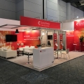 Keeping brand imagery top of mind, stevensE3 developed a design that allowed for private meeting space, yet left visibility such that the space would not appear smaller for having enclosed spaces. Several meeting spaces were incorporated into the relatively small space allowing for multiple conversations to happen simultaneously. Stevens also utilized the maximum allowable 4m in height to create distance branding. The design of the exhibit appeared in a highly professional presentation through the use of linear aluminum construction, clear acrylic paneling, professional furniture, and decorative, yet simple finishes. The raised floor also became a key feature, allowing a separation from the show floor.