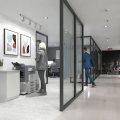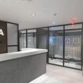stevensE3 designed a modular space created from clear panels, powdercoated aluminum profiles, custom wall panels and various custom fabricated elements to generate a completely custom finish created to the exact specifications of the client including the fabrication of filing cabinets, counters, a boardroom table, all walls and clear glass panels. The use of clear glass allowing natural light to not only brighten the offices with windows, but to extend that light to those without windows. A custom ceiling with fabric ceiling and integrated lighting helped hide electrical conduit while creating an interesting feature to the central corridor of this office environment. Shown in the above photos are some of the concept renderings along with some completed images of the areas.