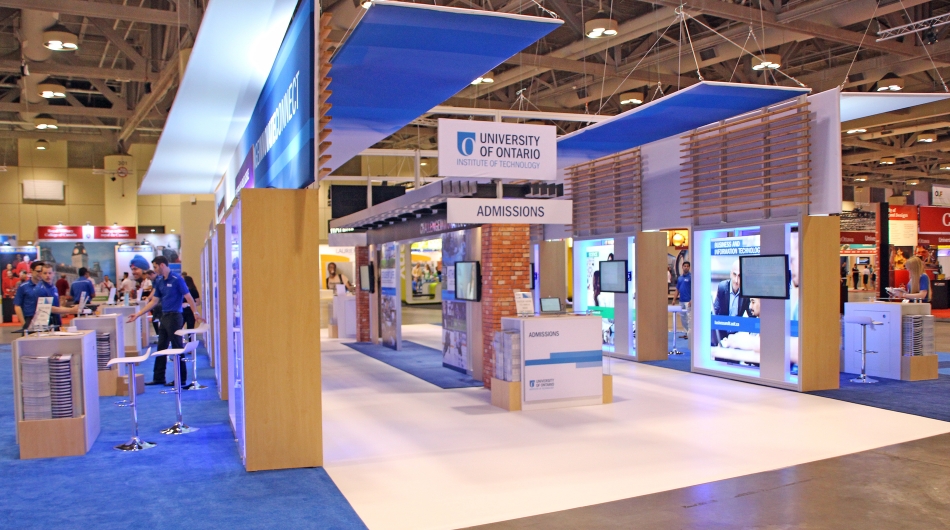 stevens E3 designed and built a unique design that took advantage of an island shape, but tilted the exhibit on its axis in order to attract the eye. Large backlit graphics, glowing LED lighting in corporate colours, and huge overhead tensioned fabric structures helped to identify the brand quickly and effectively. 12 touch screen monitors were included within the pavilion to allow interactivity with students without having to have a UOIT representative with the student all the time, and allowing the student to explore the campus by themselves interactively. Faculty counters, each branded with UOIT branding, were developed with customized brochure dispensing embedded within the counter to reduce floor space but maximize brochure dispensing capabilities. Carpeting was brightly coloured with custom logo inlays to continue the brand experience attendees would have in walking the booth. Our "pathway to success" through the centre of the booth allowed for two "hallways" where campus lifestyle was depicted allowing the student to truly "put themselves on campus" at the event. Elements from architecture within the campus were emulated within the booth environment.