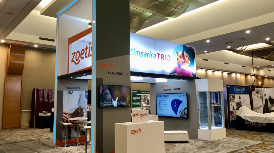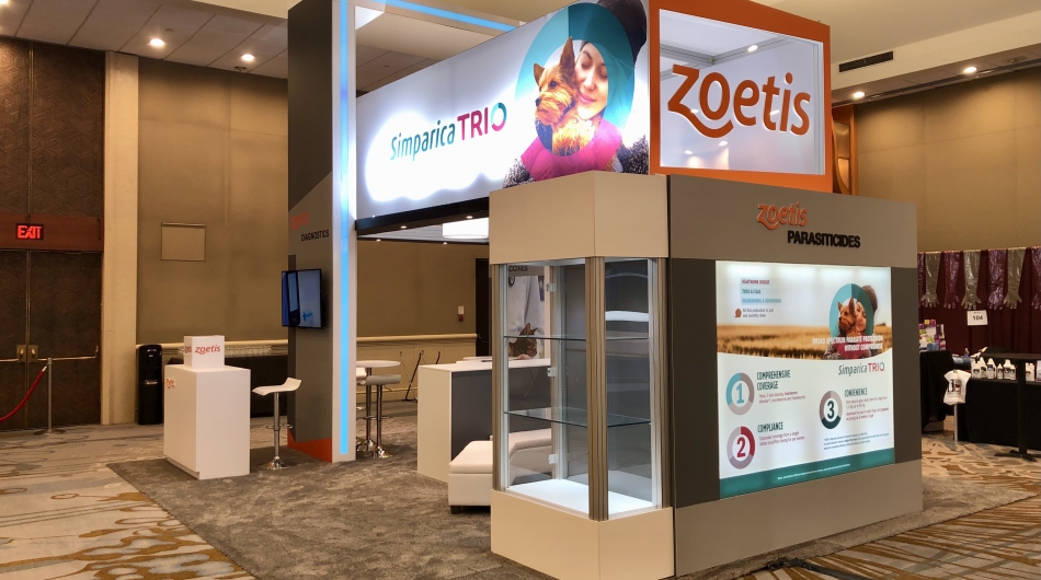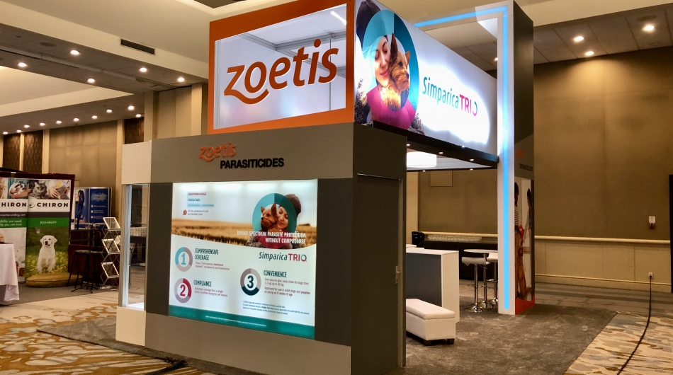 Long time client Zoetis sought a way to update their brand presence at trade events allowing for distance branding messaging, video, meeting space and product placement within the booth space.